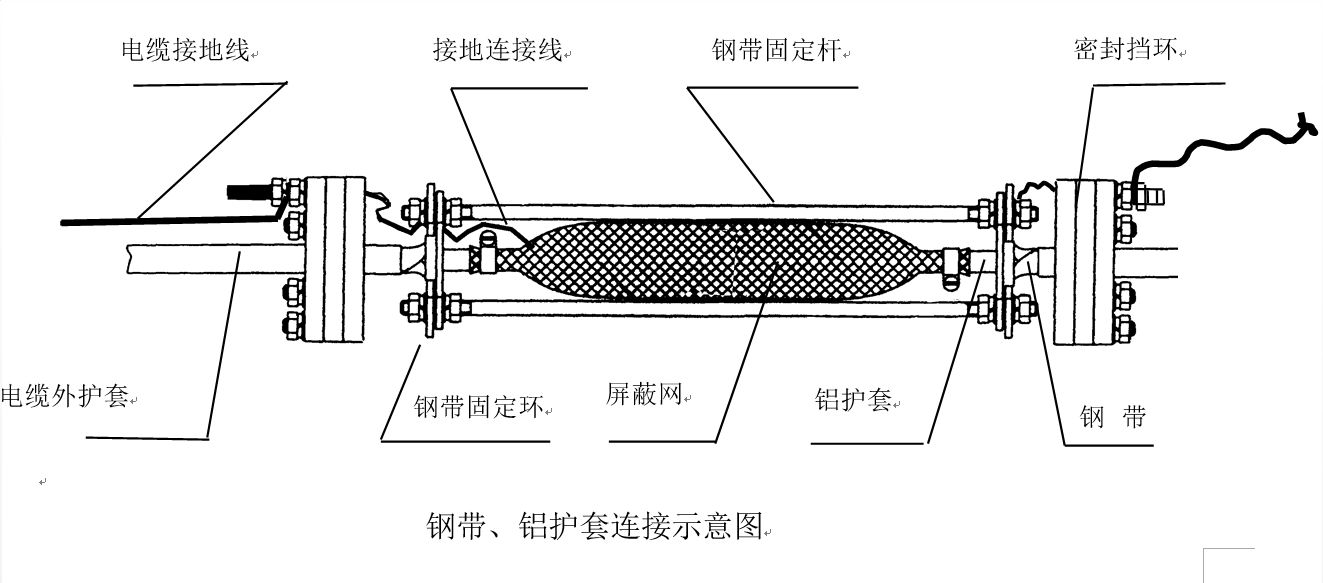 2) 密封挡环和钢带固定环在电缆中的位置,要严格按图5-2所示组装顺序和零件位置的方向安装。