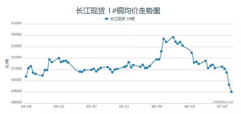 电缆原材料(铜材)之重点产品解析:6月份铜价走势并不平静。伦铜在刷新年内新高之后,又大幅下挫至年内低位。所幸沪期铜走势相对平稳,月内,沪铜主力运行于51000-55000元之间。现货铜价格跟随沪期铜走势,呈现先扬后抑格局,表现稍弱于盘面,月内高低价格越2500元左右。